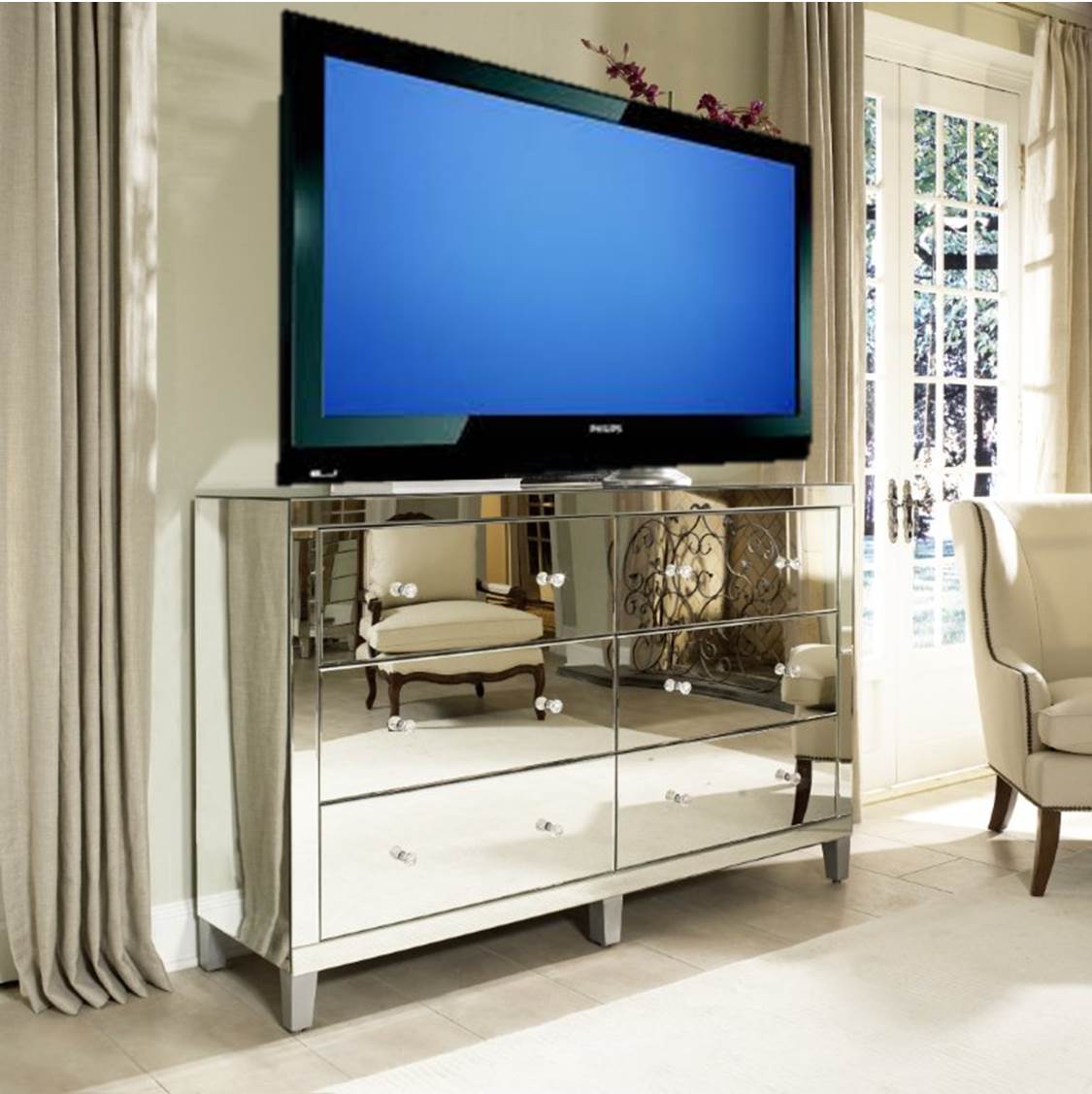 For the last few weeks, I’ve been searching for the perf media cabinet. Prob is, many are too long (NYC apts are super small), too traditional looking and come in shades of meh. Since the decor in MG Apt is Manhattan Glamour Style, I need something that reflects light, is not too bulky and avail in a gorg shade of fabulush. Dressers come in tons of different colors & sizes (including MG fav – mirrored). Instead of investing in an everyday media console, why not re-purpose a beautiful dresser into your new reality show viewing center.